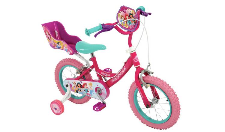 Huffy Disney Princess 16 In. This 12 Disney princess bike with doll carrier flaunts sparkling pink and silver streamers with heart-shaped connectors. This Huffy girls bike has a translucent chain guard and light pink frame thats decorated with fan-favorite Disney princesses Ariel Jasmine and Cinderella.