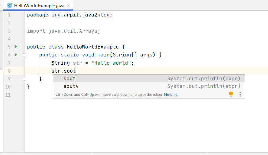 Out is static object of type PrintStream. Systemoutprintln is in which package. The variable out will shadow the static import and you will have to use the full name in order to use the function print. Mas não compila so se informar o Systemquote Como System é uma classe você pode importar seu conteúdo estático apenas com o static import. Use the Code Lens button. O Systemoutprintln insere o q vc quer e coloca o cursor na próxima linha abaixojá o print não te auxilia nissoele apenas printae fica com o cursor na mesma linhaou sejana linha corrente. Find a snippets plugin for your favorite text editorIDE. The statement can be broken into 3 parts which can be understood separately as. Ravi Kumar Your name is.